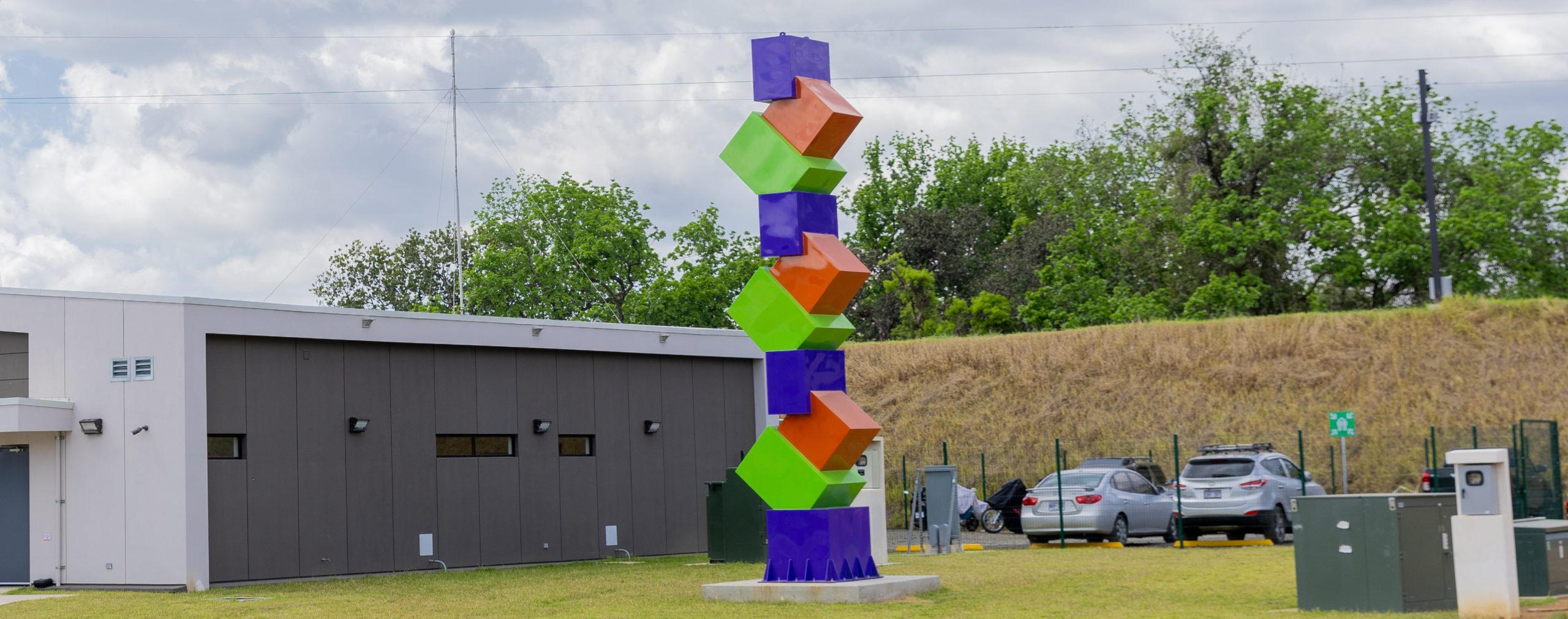 Towering at an impressive eight meters, “Malabares” showcases a vibrant interplay of colors, each carrying profound symbolism: purple hue represents creativity and spirituality; green embodies nature and balance; and orange conveys energy and vitality. Through its dynamic fusion of three-dimensional geometric forms, the sculpture masterfully balances stability and motion, evoking a sense of harmony.